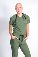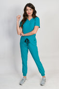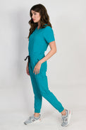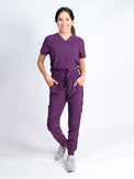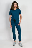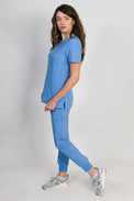 Our Fleur Women's Mitered Neck Top and Jogger Pants Set, designed to offer a seamless blend of comfort and functionality for healthcare professionals. The top features a V-neck, princess seams, and front patch and welt pockets, while the pants come with a flat front waistband, adjustable drawstring, and eight pockets. Crafted from our innovative MG Flex 2.0 Technology fabric, these scrubs provide 6-way stretch, wrinkle resistance, moisture-wicking, and a silky smooth finish.