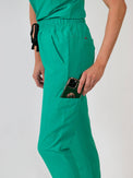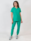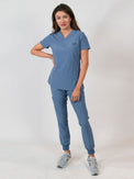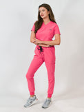 Our Aurora Women's Scrubs Set with One Pocket V-Neck Top and Jogger Pants is designed to offer a seamless blend of comfort and functionality for healthcare professionals. The top features a V-neck, princess seams, and a front patch pocket, while the pants come with a flat front waistband, adjustable drawstring, and six pockets. Crafted from our innovative MG Flex 2.0 Technology fabric, these scrubs provide 6-way stretch, wrinkle resistance, moisture-wicking, and a silky smooth finish.